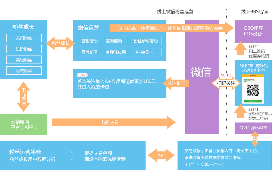 有完整的O2O一体化服务体系,打通线上线下交易、实现跨平台运营,帮助线下企业打造线上线下融合的商业闭环。提供基于移动互联网的精准营销工具,帮助商家构建消费行为数据资产。构建全渠道模式。整合线下,联动线上,全渠道O2O运营,为商家和消费者都带来前所未有的体验。